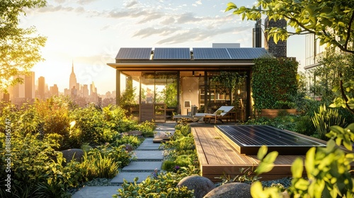 house, solar panel, garden, landscape, city skyline, sunset, patio, architecture, environmentally friendly, greenery, relaxation, urban living, residential area, sun ray, sunlight, leisure, calmness, plant, tree, energy efficiency, home, backyard, space, nature, scenic view, summer, harmony, sky, horizon, luxury, comfort, renovation, environment, garden path, shrub, material, wood, stone
