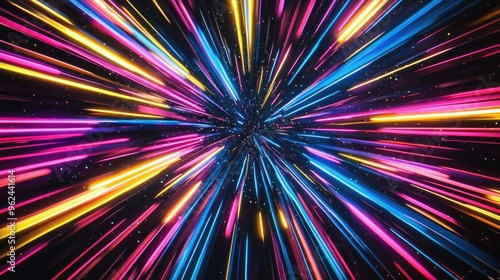 Beautiful neon light rays in starburst pattern, exploding in the universe with dynamic blue, pink, yellow, and purple lines on black