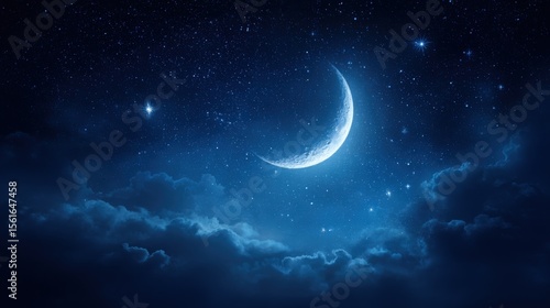Beautiful night sky with a crescent moon and shining stars over cloudy clouds.