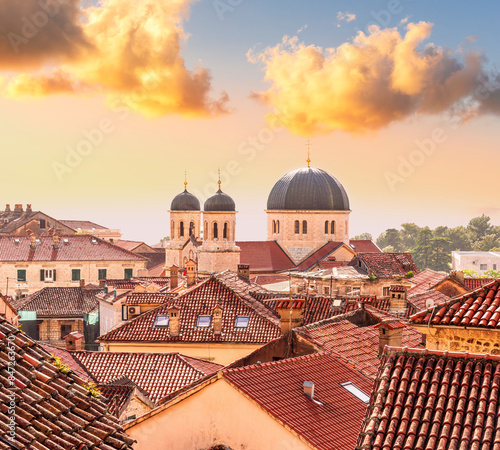 city, church, landscape, sunset, town, orange, red, tile, roof, building, house, catholic, architecture, old, vintage, antique, chapels, tower, cupola, dome, cloudy, sky, background, city landscape, cathedral, venice, venetian, italy, montenegro, kotor, adriatic, religion, traditional, street, history, downtown, center, view, sunrise, evening, morning, yellow, landmark