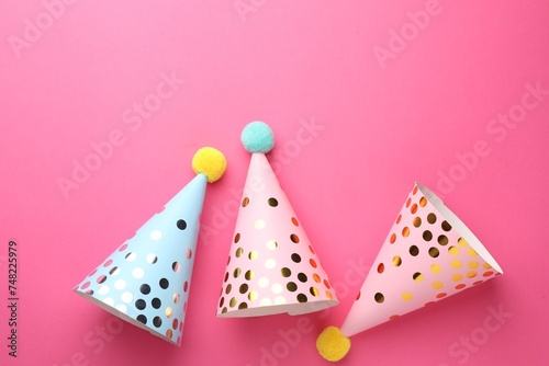 Beautiful party hats on pink background, top view. Space for text