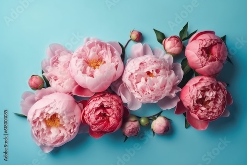 Beautiful peony flowers on blue background.