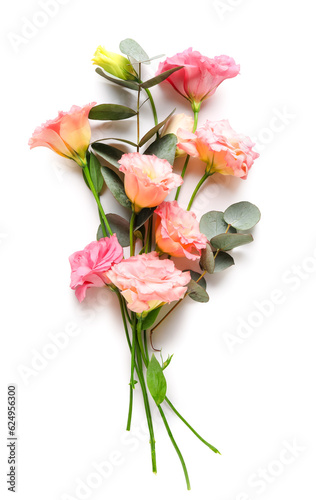 Beautiful pink eustoma flowers and eucalyptus on white background