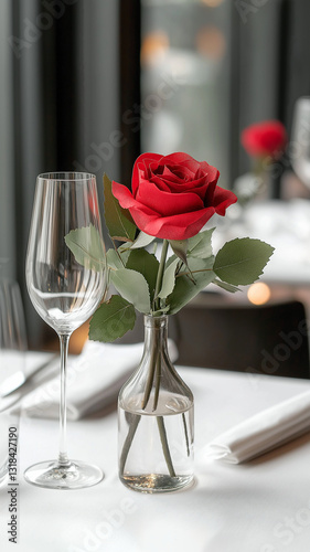 rose, vase, dining, table, glasses, flower, eatery, decoration, elegant, romantic, stem, leaf, white, setting, fine dining, centrepiece, tableware, hospitality, intimate, celebration, event, glassware, modern, stylish, atmosphere