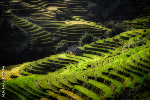 Beautiful rice terrace fields at Mu Cang Chai in Vietnam. Many rice fields planted as terraced belong to shape of hill and mountains. Popular place attractions for domestic and international tourists.