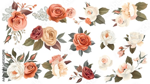 Beautiful romantic flower collection with roses, leaves, floral bouquets, flower compositions