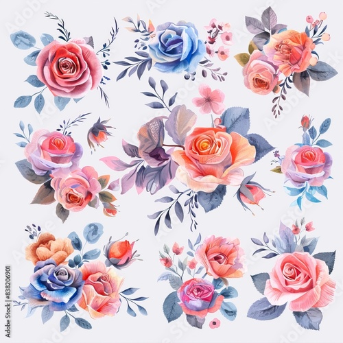 Beautiful romantic flower collection with roses, leaves, floral bouquets, flower compositions