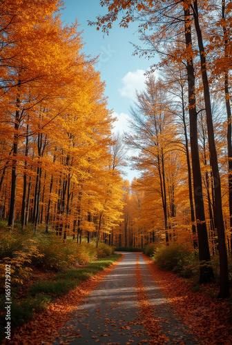 Beautiful scenic autumn forest landscape with a winding road covered in colorful fallen leaves.