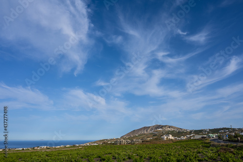 Beautiful scenic landscape of green vineyard and hill on Santorini island, Greece. Aegean sea. Summer nature. Blue cloudy sky.