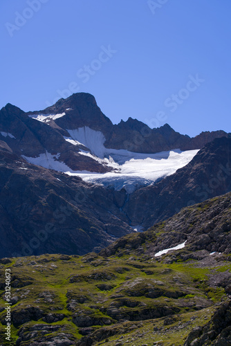 Beautiful scenic view of mountain panorama with Tschingelfirn Glacier at Swiss mountain pass Susten on a sunny summer day. Photo taken July 13th, 2022, Susten Pass, Switzerland.