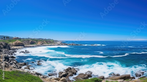 Beautiful seascape with a rocky coast and a bright blue ocean. The waves are crashing against the rocks, creating a dramatic scene.