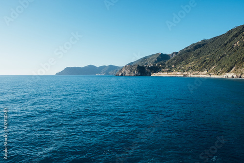 Beautiful seascape with blue sky, smooth water surface and rocky cliffs in Liguria coastal area. Popular italian travel destination.