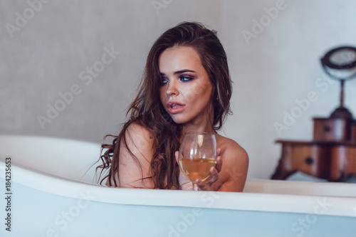 Beautiful sexy woman relaxed in the bath with a glass of wine.