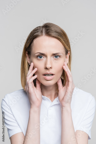 beautiful, person, female, young, adult, people, beauty, portrait, european, emotion, emotional, blond, alone, attractive, casual attire, posing, shocked, gesticulate, scared, frightened, studio shot, caucasian woman