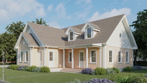 architecture, building, property, exterior, home, house, lawn, yard, landscape, design, residential, facades, estate, construction, style, family, garden, grass, modern, tree, sky, cloud, window, roof, dormer, porch, column, flower, trim