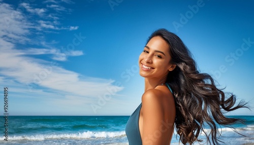 beautiful smiling woman with long hair enjoying sea at summer