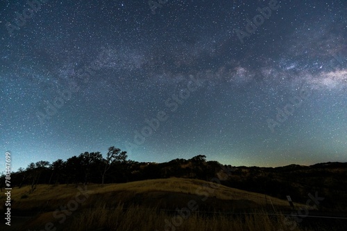 Beautiful starry sky over the hills and trees.