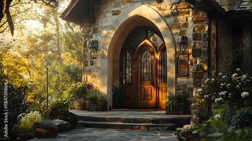 Beautiful stone cottage entrance with warm afternoon light and lush garden