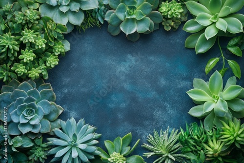 Beautiful succulents arranged on a dark blue background, creating a natural frame with empty space in the center