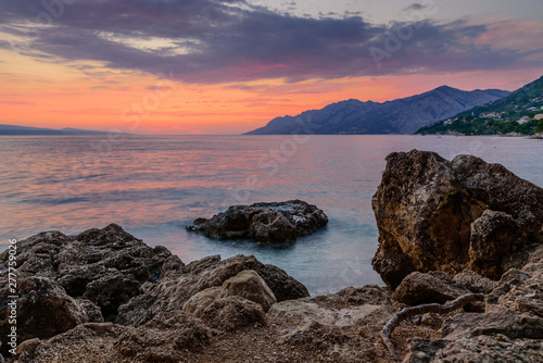 Beautiful sunset on the sea. The Adriatic sea during sunset, the village of Brela, Makarska Riviera, Croatia