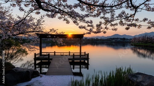 sunset, lake, water, pier, wooden, blossom, branch, flower, pink, sky, mountain, landscape, nature, calm, peaceful, scenic, view, evening, light, calmness, dusk, serene, beauty, tree, plant, reed, grass, shore, rock, garden, structure, beam, horizon, stillness, tranquil, balance, shadow, vibrant, warm, glow, natural, dawn, springtime, flower petals