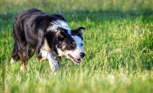 Beautiful tri-coloured border collie sheepdog stalking in a field