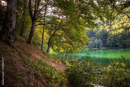 Beautiful turquoise lake surrounded by green forest and mountains. Balkana lake in Bosnia and Herzegovina.