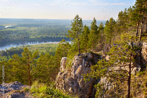 Beautiful view from the cliff to the rocks, forest, river on a warm summer day.