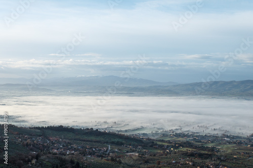 Beautiful view of Umbria valley in a winter morning, with fog covering trees and houses