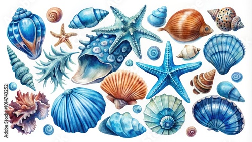 Beautiful watercolor depictions of blue sea shells and marine life on a crisp white background, ideal for enhancing various design projects and aquatic themes.