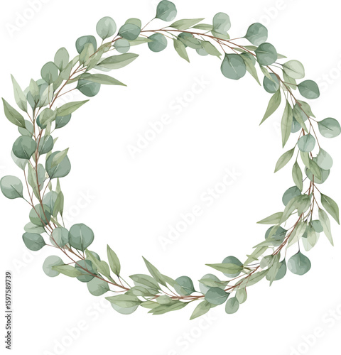 Beautiful watercolor eucalyptus greenery wreath with delicate leaves and floral accents for invitations and decor