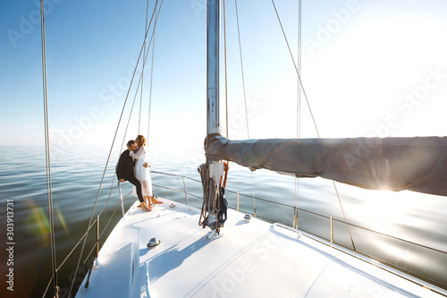 Beautiful wedding couple on yacht at wedding day outdoors in the sea. Beautiful elegant bride in a white dress and stylish groom on the luxury yacht sailing down the sea. Together. Wedding day.