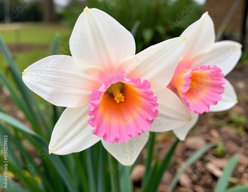 flower, daffodil, white, pink, bloom, garden, nature, flower petals, flora, outdoors, spring, vibrant, colourful, botanical, beauty, fresh, delicate, green, floral, plant, decorative, closeup, seasonal, landscape, bright, bud, rural, natural, growth, cheerful, serene, scenic, blooming, gardenia, contrast, sunny, lovely, artistic, colours, gardener