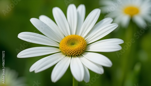 “Beautiful White Daisy Flower with Yellow Center in Full Bloom, Macro Close-Up of Fresh Chamomile or Daisy Blossom Isolated Against Soft Green Blurred Background, Spring Nature and Floral Beauty Conce
