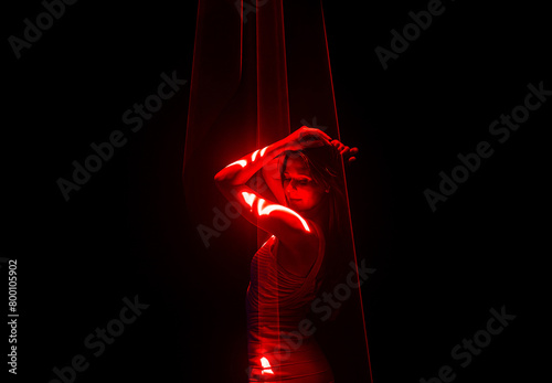Beautiful woman dancing under red illumination, laser light, neon party night club. Projection mapping. Interactive exposition installation.