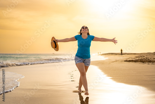 Beautiful woman walking on sunny beach Santa Maria, Sal Island, Cape Verde