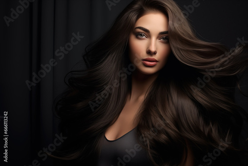 Beautiful woman with flowing brown hair posing on a dark background