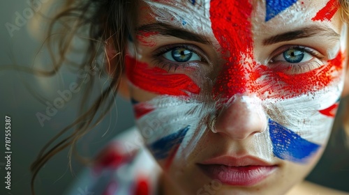 beautiful woman with her face painted with the flag of England in high resolution and high quality