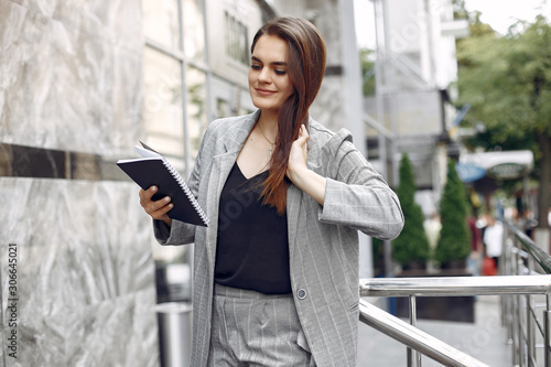 Beautiful woman working. Busineswoman in a stylish clothes. Lady use the notebook