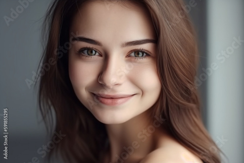 beautiful young adult woman or teenager, brunette close-up portrait, smile and joy. Generative AI