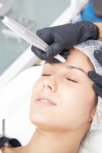beautiful young lady getting tattoo. professional tattooist making eyebrow make up