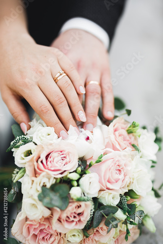 Beautiful young wedding couple posing with bouquet of flowers in hands