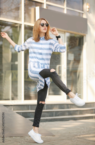 attractive, background, beautiful, beauty, building, casual attire, caucasian, city, clothes, dance, dancing, elegant, fashion, female, glamour, hipster, jean, leisure, lifestyle, look, model, modern, outdoors, person, posing, rest, ripped, shirt, shoe, sneaker, spring, street, striped, style, stylish, summer, sunglasses, town, trend, trendy, trousers, urban, vogue, woman, young