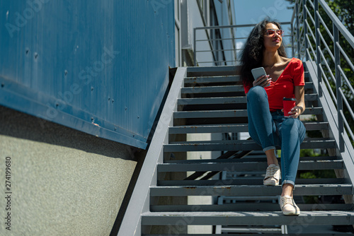 woman, young, mobile, phone, mobile phone, smartphone, adult, caucasian, female, girl, lady, stair, staircase, smile, contraption, device, modern, technology, cup, hot drink, take-away, drink, phone, wi-fi, cyberspace, beautiful, person, goggles, brunette, pretty, full, length, outdoors, city, street, outside, urban, step, ladder, staircase, sunglasses, attractive, leisure, jean, copy space, to sit