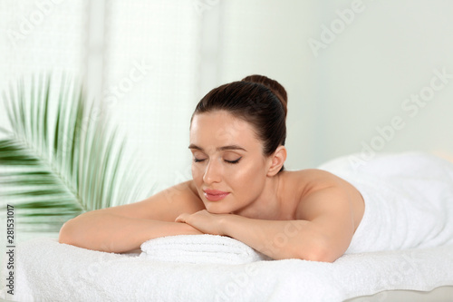 Beautiful young woman relaxing in spa salon