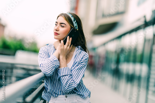 Beautiful young woman speaking on mobile phone standing on rooftop