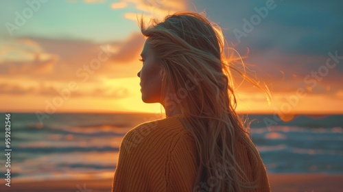 Beautiful young woman walking near the beach and enjoying the sunset. AI generated image