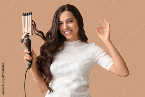 beautiful, beige, curling, iron, ok, woman, young, adult, appearance, background, beauty, brunette, care, caucasian, colours, curl, device, electric, equipment, fashion, female, girl, glamour, hair, coiffure, hair care, coiffure, hot, length, long, people, person, portrait, pretty, salon, strand, style, treatment, trend, vogue, wavy