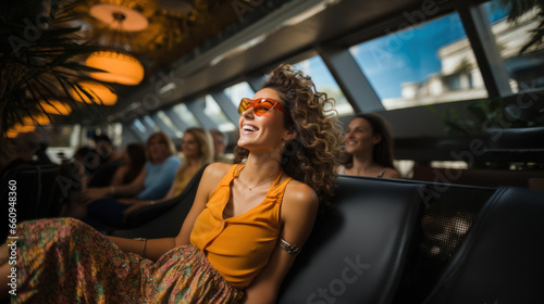 Beautiful young woman with curly hair and orange sunglasses sitting indoor, signifying light sensitivity. Another visual impairment.