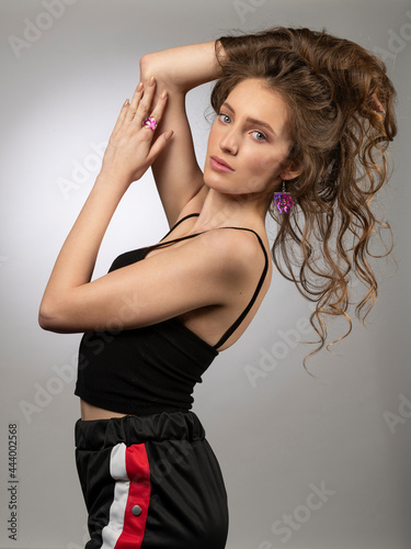 beautiful young woman with jewelry posing keeping hair